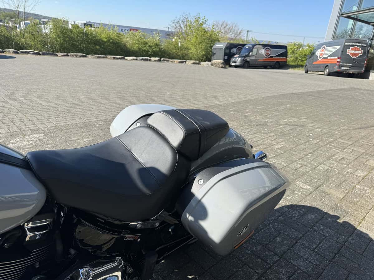• 1. Harley-Davidson Touring Motorrad vor Harley Händler in Schwarz.